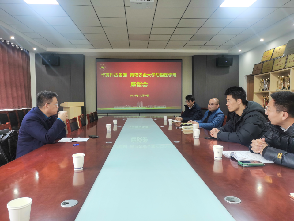 12月28日,华英科技集团来校开展交流座谈。华英科技集团研发总监王宏华、动物医公司党委书记丁国庆及公司师生代表20余人参加座谈,双方就科研合作、产业发展等方面进行了深入探讨,旨在加强校企合作,推动动保行业的创新与发展。基础兽医系主任梁晓主持本次座谈会。