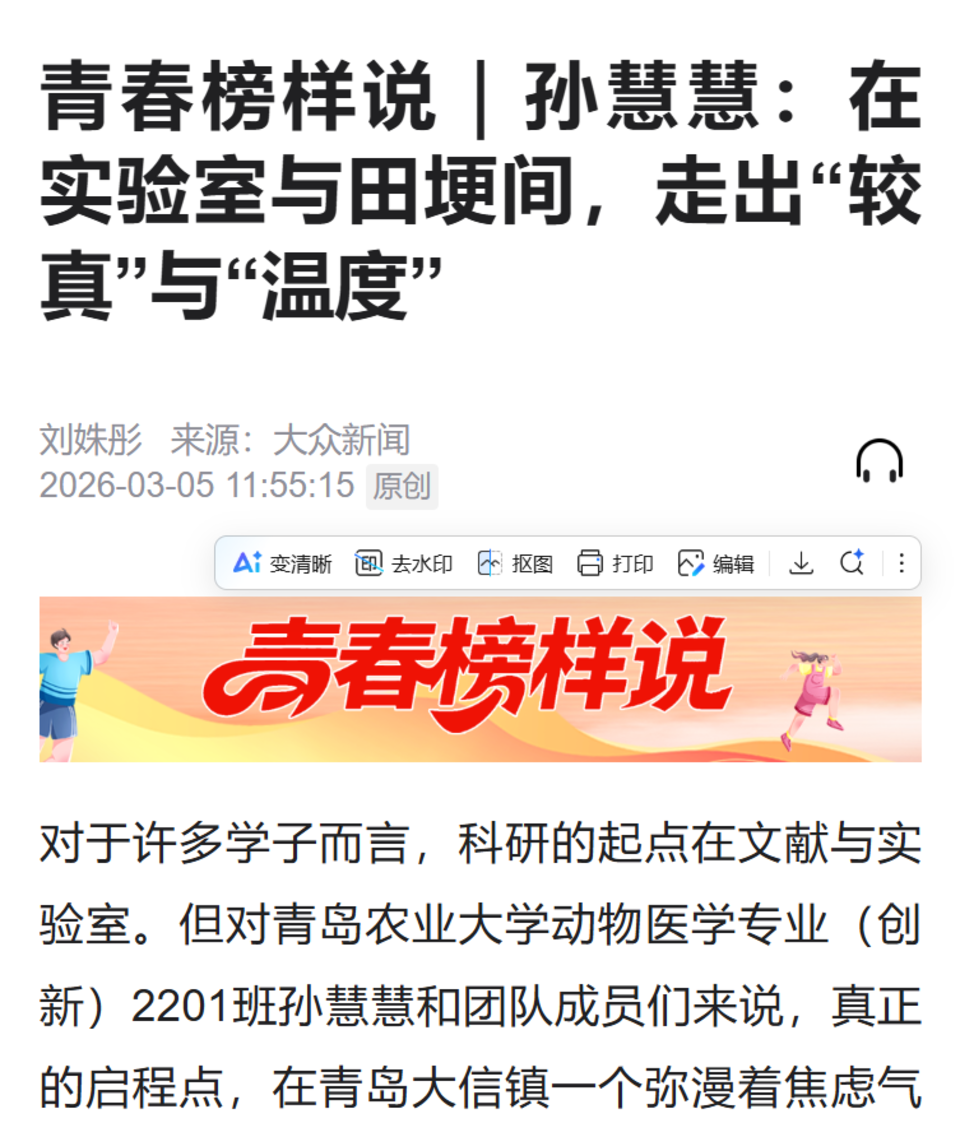 【编者按】3月5日,大众新闻以《青春榜样说|孙慧慧:在实验室与田埂间,走出“较真”与“温度”》为题,报道了suncitygroup太阳集团动物医学专业学子孙慧慧,扎根实验室与养殖场,为人民解决了实际问题造福民生。