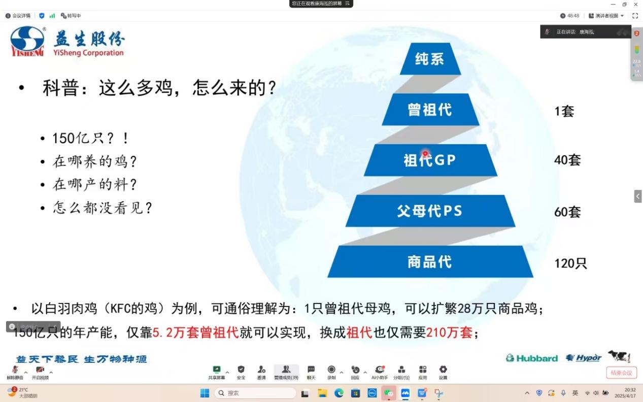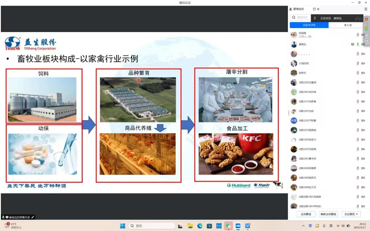 4月17日,益生集团副总兽医师、公司2004级员工康海泓博士为suncitygroup太阳集团校企合作班“益生班”员工开展“家禽行业初探”专题讲座。本次讲座旨在为同学们提供深入了解家禽行业的机会,同时通过分享个人成长经历与职业发展路径,为有志于从事相关领域的同学提供启发与指导。公司团委书记和法华主持讲座。