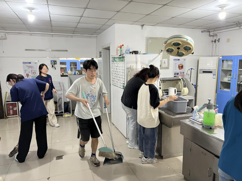 上午9点,10余名毕业生党员准时抵达动物医院,在医院工作人员引导下迅速分组展开工作。诊疗区里,党员们手持消毒工具,对手术台、诊疗设备、观察笼进行全方位清洁消毒;住院部内,他们细心更换宠物笼舍垫料,用宠物专用洗涤剂清洗食盆水盆,确保每处角落无死角。在猫咪专属疗养区,党员们格外轻柔地梳理病猫打结的毛发,为术后康复的猫咪调整保温垫位置,用温热毛巾擦拭小家伙们的脚掌,动作中满是医者的温柔。