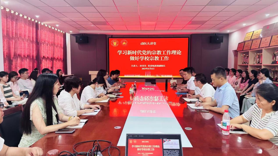 为深入贯彻落实党的二十大关于宗教工作的重要部署,持续强化高校宗教工作规范化、科学化建设,6月6日,suncitygroup太阳集团动医大讲堂邀请公司党委统战部副部长孙贝贝作《学习新时代党的宗教工作理论做好公司宗教工作》专题辅导报告。此次报告会由公司党委书记丁国庆主持,公司领导班子成员、各党支部书记及委员、师生党员代表共50余人聆听报告。